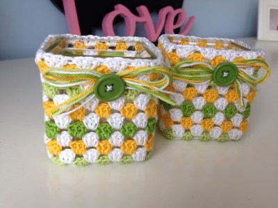Benodigdheden: potje/bakje, 50 cm lint, knoopje/bloemetje of iets dergelijks, haaknaald (nr 3 heb ik gebruikt), haakkatoen of wol en een waxinelichtje.