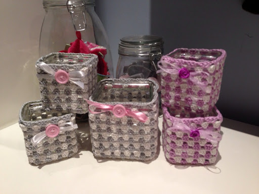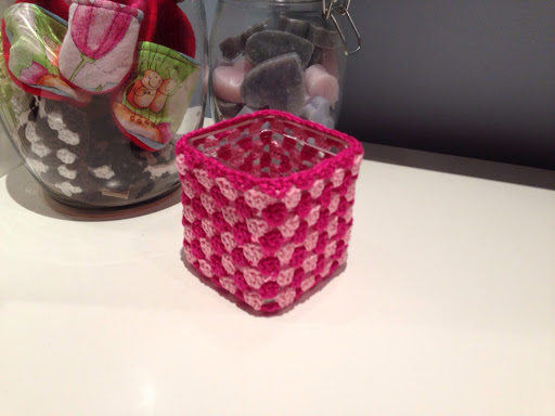 Benodigdheden: potje/bakje, 50 cm lint, knoopje/bloemetje of iets dergelijks, haaknaald (nr 3 heb ik gebruikt), haakkatoen of wol en een waxinelichtje.