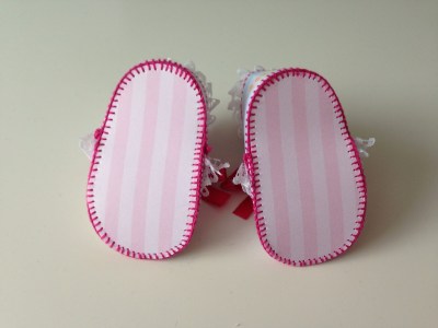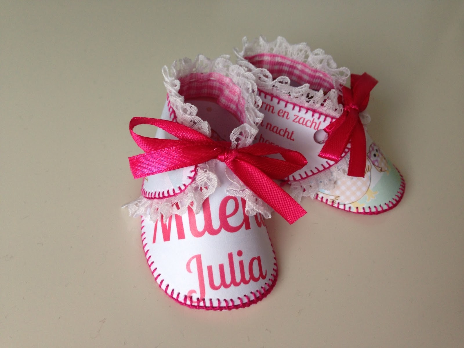 Ik kreeg één schoentje, gemaakt van het geboortekaartje van onze zoon, verpakt in een kunststof ei. Ik vond het zo een ontzettend leuk idee, dat ik het internet af ben gaan struinen naar patronen. Buiten dat de patronen zeer schaars waren, vond ik dat de patronen het allemaal net niet hadden. Ik probeerde vanalles uit met gekleurd karton en uiteindelijk kwam ik tot het ontwerp, waarvan ik er al ruim 50 paar heb gemaakt.