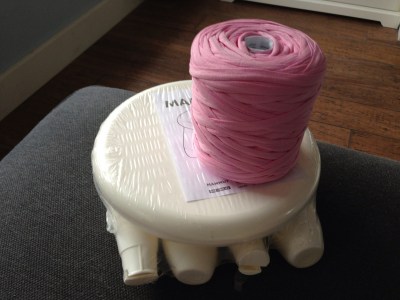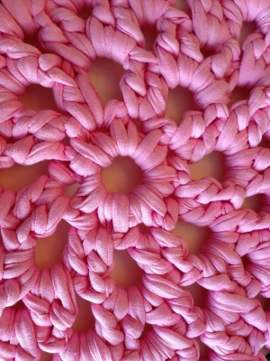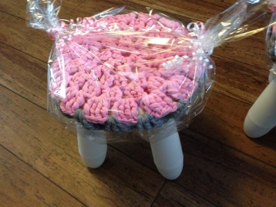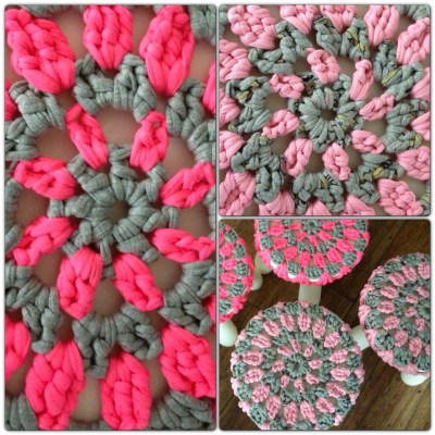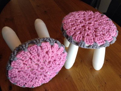 Ik bladerde in een boek dat ik onlangs voor € 2,50 heb aangeschaft via Marktplaats.nl, met daarin bijzondere haak- en breifiguren. Ik bekeek wat ronde patronen en ineens bedacht ik me dat het misschien leuk zou zijn om iets om de witte krukjes te haken met dikke wol. Ik had eens een bol dikke roze tricot wol gekocht om wat van te maken, maar inmiddels stond de bol al bijna een jaar in de kast bij z’n soortgenoten. 🙂