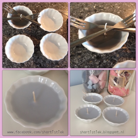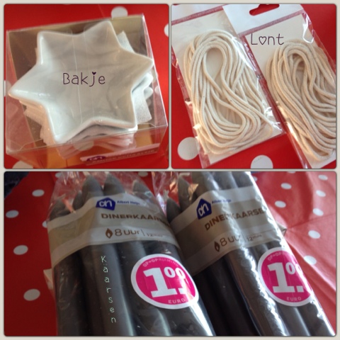 Ik bestelde bij een online hobbywinkel wat kaarslont in verschillende maten, bij de Albert Heijn kocht ik 3 pakken kaarsen en wat leuke amuse schaaltjes. De schaaltjes kwam mijn zus mee aanzetten toen ik de boodschappen op de band aan het laden was. Ze wist van mijn plannen af en vond de schaaltjes uiterst geschikt. 🙂Â