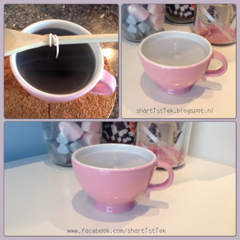 In de eerste instantie wilde ik verschillende soorten leuke theekopjes vullen met kaars. Zo had ik al bijna een jaar een schattig roze theekopje in de kast staan. Ik heb het kopje eens gekocht bij een kringloopwinkel (tja, waar anders). Ik vond de vorm en kleur geweldig en wist dat ik er wel eens wat van zou kunnen maken. Nu was het dan zover….