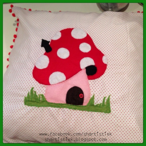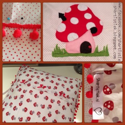 Ik pakte direct de naaimachine, knipte de stof uit en begon te naaien! Het kussensloopje had ik diezelfde avond nog klaar. De paddenstoel had ik vrijdagavond al uitgeknipt, dus ik kon alles op het kussensloopje spelden. Zondagavond had ik de stam er al op zitten en maandag heb ik in de schaduw in de tuin, de rest van de paddenstoel applicatie er opgenaaid.