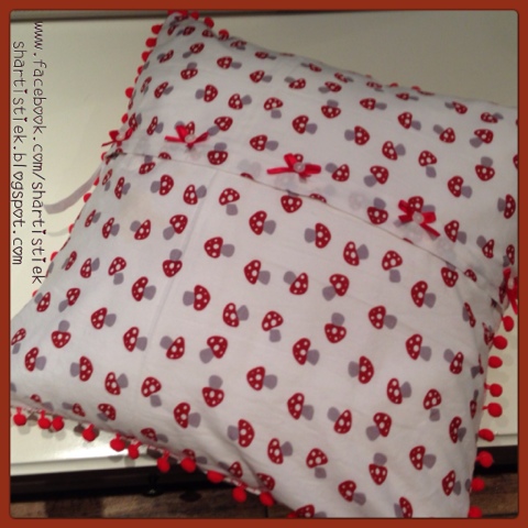 Ten slotte naaide ik aan de achterzijde, ter hoogte van de rits, 5 rode strikjes op de stof, met een klein wit knoopje. En natuurlijk een instiklabel, die ik haast vergat! 🙂