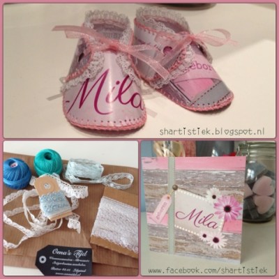 Lampjes, lintjes, zeepjes, kantjes, bandjes, kasten en oud keukengerei, bij Oma’s Tijd slaag ik altijd wel voor iets. Dit keer liep ik tegen een aantal kantjes en 2 ouderwetse kleine bolletjes haakgaren aan. Voor een zacht prijsje werden ze van mij. Eenmaal thuisgekomen, kon ik één van de schattige ouderwetse kantjes al gebruiken voor de geboorteschoentjes van Mila. Het geeft een beetje Shabby Chic sfeertje.