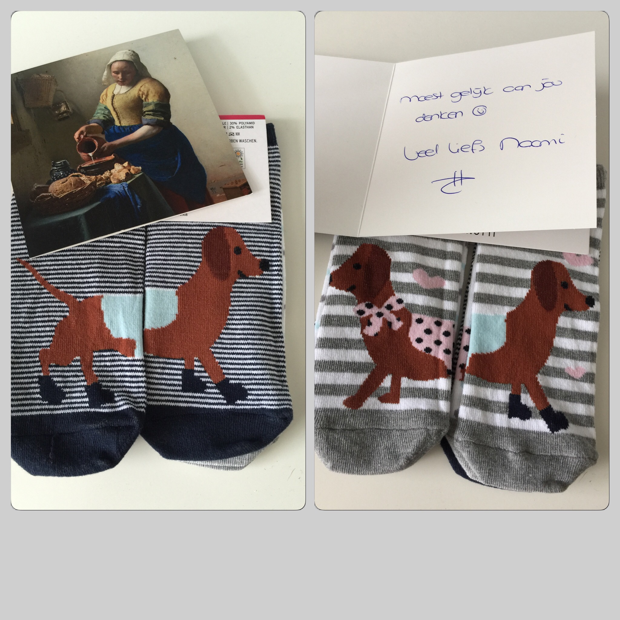 De gestreepte teckels staan verkeerd op de foto, ze horen elkaar te kussen! Ik vind ze eigenlijk te leuk om te dragen, dus ze hangen nu nog even in mijn hobbykamer op mijn gaaspaneel. En misschien moet ik maar een paar foute slippers kopen, zodat ik ze kan showen als ik ze draag. 😂
