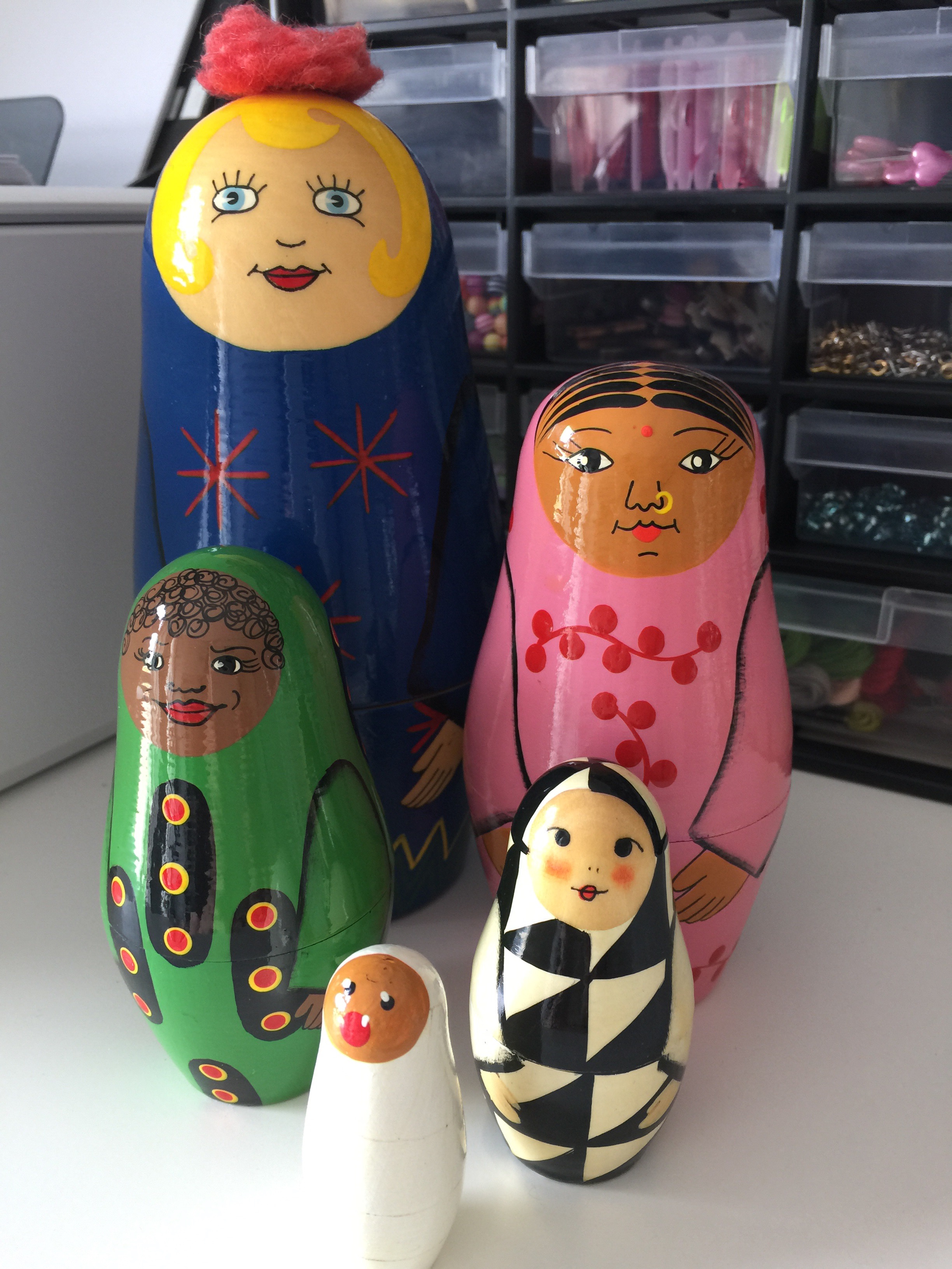 Sommigen van jullie weten misschien wel dat ik Matroesjka/Baboesjka poppen leuk vind! Het liefst een enorm grote of juist een hele kleine met zoveel mogelijk poppetjes. Het huis staat er niet vol mee hoor, maar in iedere kamer is er wel één te vinden. De leukste zijn die ik heb gekregen. 😁 Zo kreeg ik gister een grappig setje van Sandra!