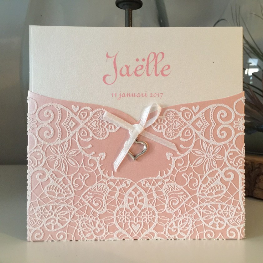 Een prachtige kaart. Het was een soort envelop, waar een los vierkant kaartje ingeschoven zat. Ik kreeg er maar één, dus ik moest even goed nadenken over de indeling. Jaëlle wilde ik voorop en dat kwam gelukkig heel goed uit.