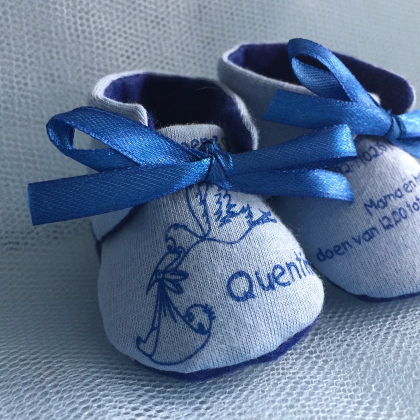 Met een berg spelden en een meetlint in de aanslag, bevestigde ik de letters op de juiste plek op de wimpels. Ik wilde de letters er met de hand op gaan naaien, voor het ‘handgemaakte effect’. Ik heb altijd een grote voorraad borduurgaren voor de geboorteschoentjes, dus voor alle kleuren vilt had ik bijpassend garen tot mijn beschikking.