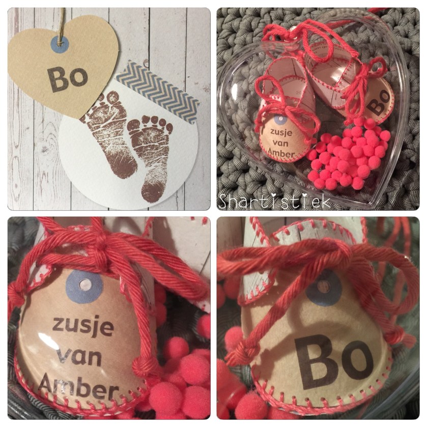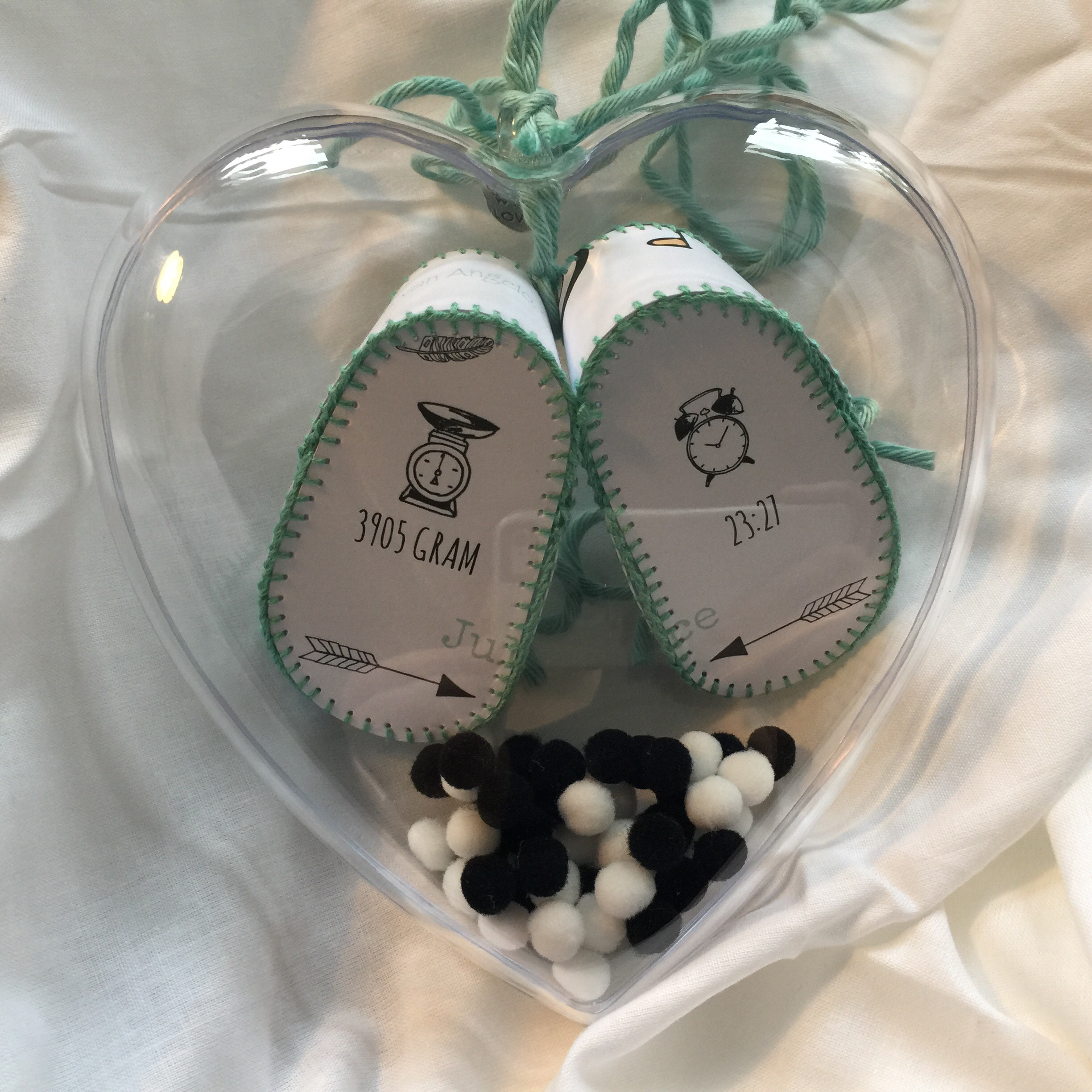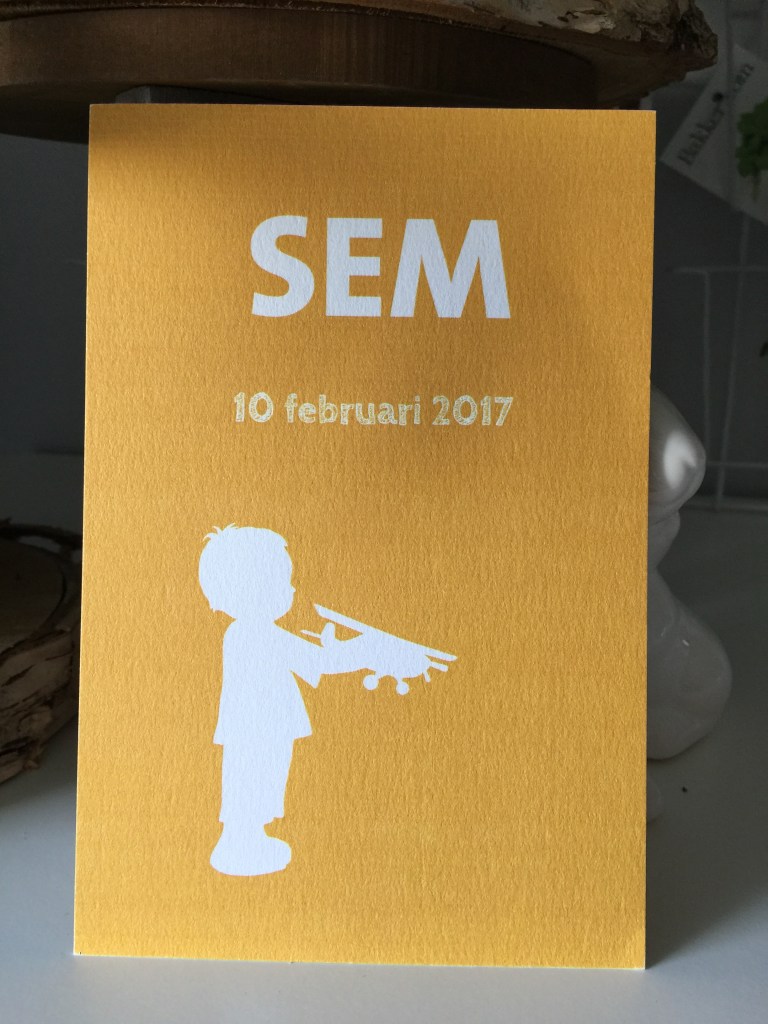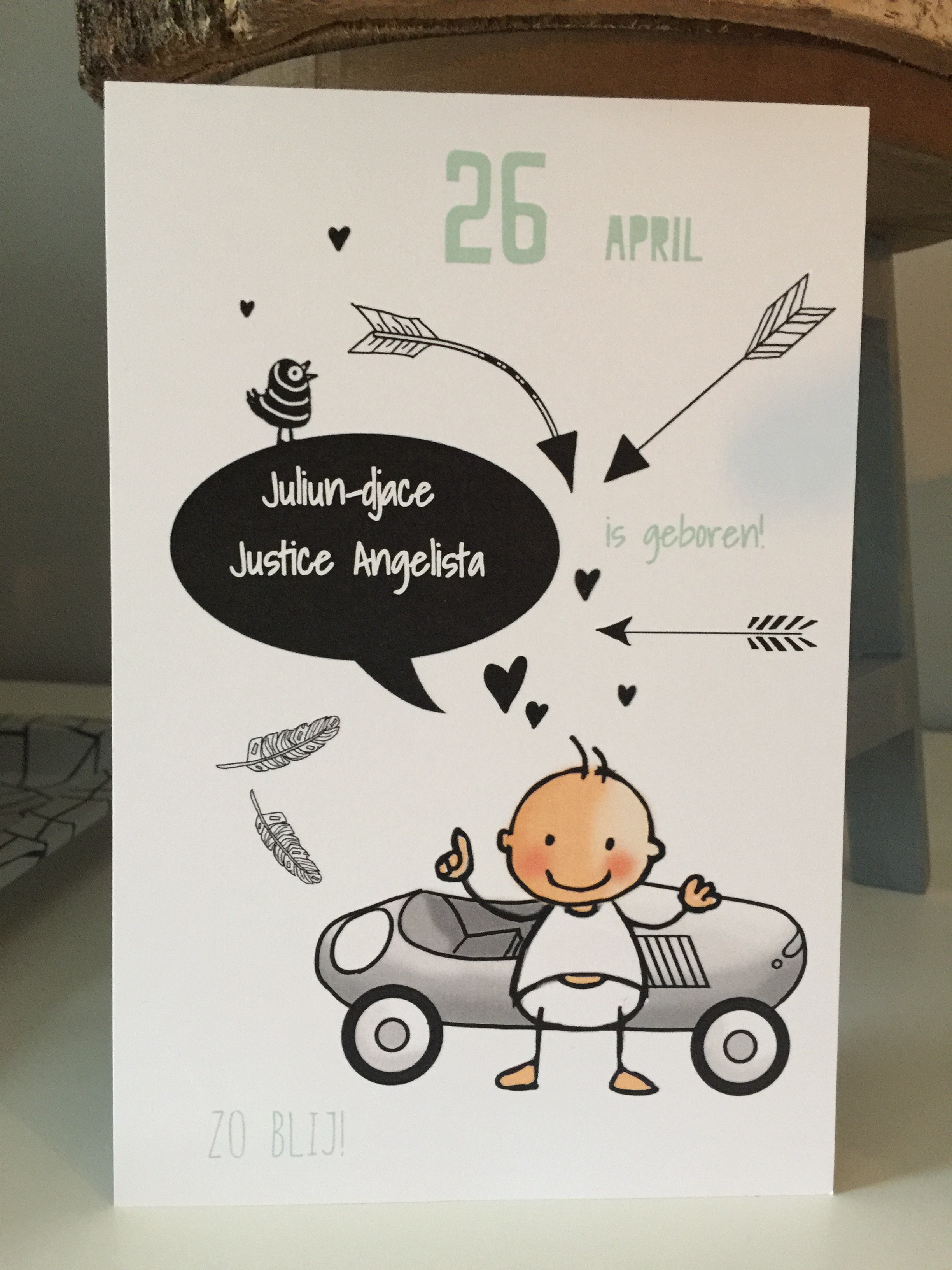 Het was inmiddels een uur of 6 en ik nam eindelijk plaats op mijn hobbytroon. 🙂 Ik (ver)knipte 2 geboortekaartjes en prikte de gaatjes erin om ze te kunnen borduren. Intussen stond Bram naast me te lamineren en Hugo zat op een kruk een waterijsje te eten. Pfff, mama zou toch maar 10 minuten voor zichzelf bezig zijn… 🙂
