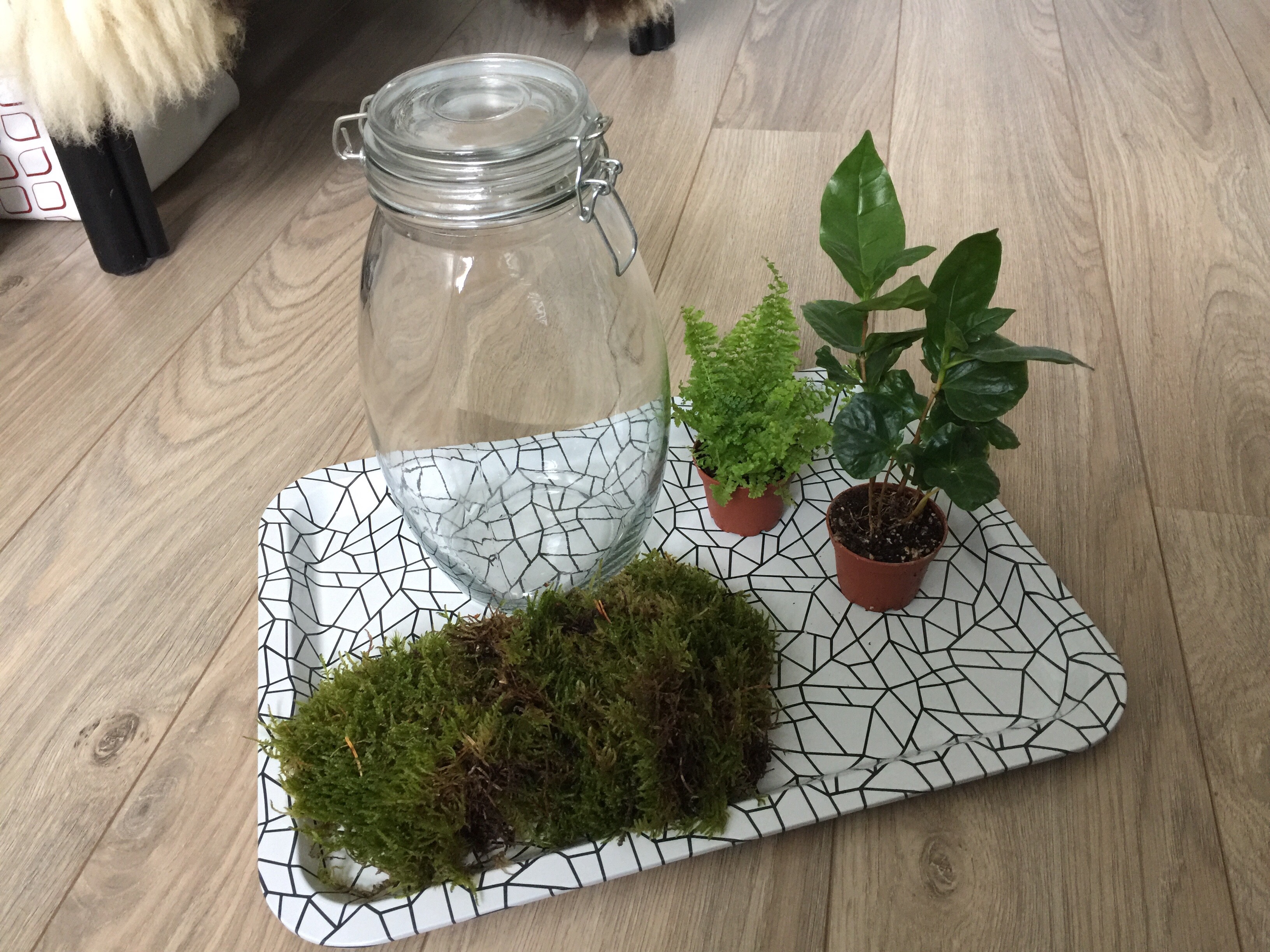 Ik heb een heleboel potten in de kast staan, van toen ik nog in de glazen potten fase zat! Ha ha. Ik gebruikte ze als kleine vitrines met bijvoorbeeld kant en klosjes garen erin. Er stonden 2 weckpotten tussen die me ideaal leken voor een mini ecosysteem. Bij Intratuin kocht ik een Pikaplantje en iets dat in mijn ogen lijkt op een kleine varen. Potgrond en mos had ik nog.