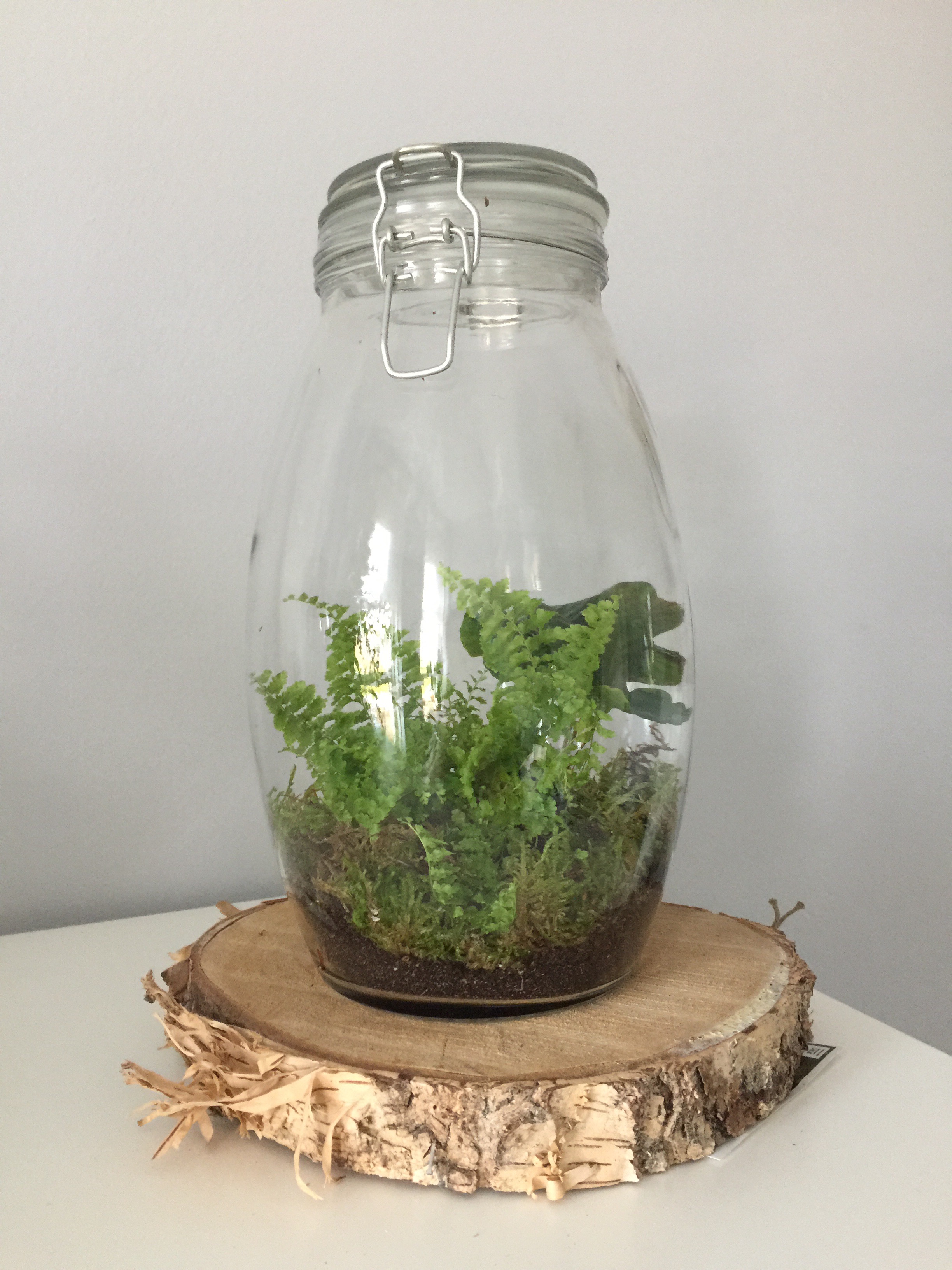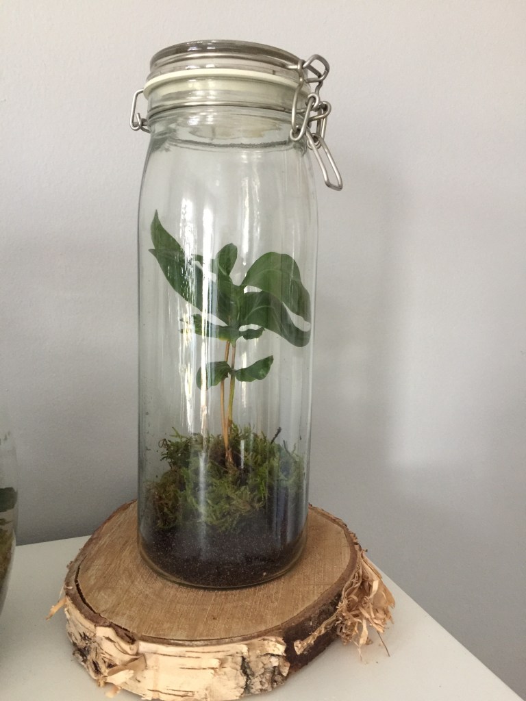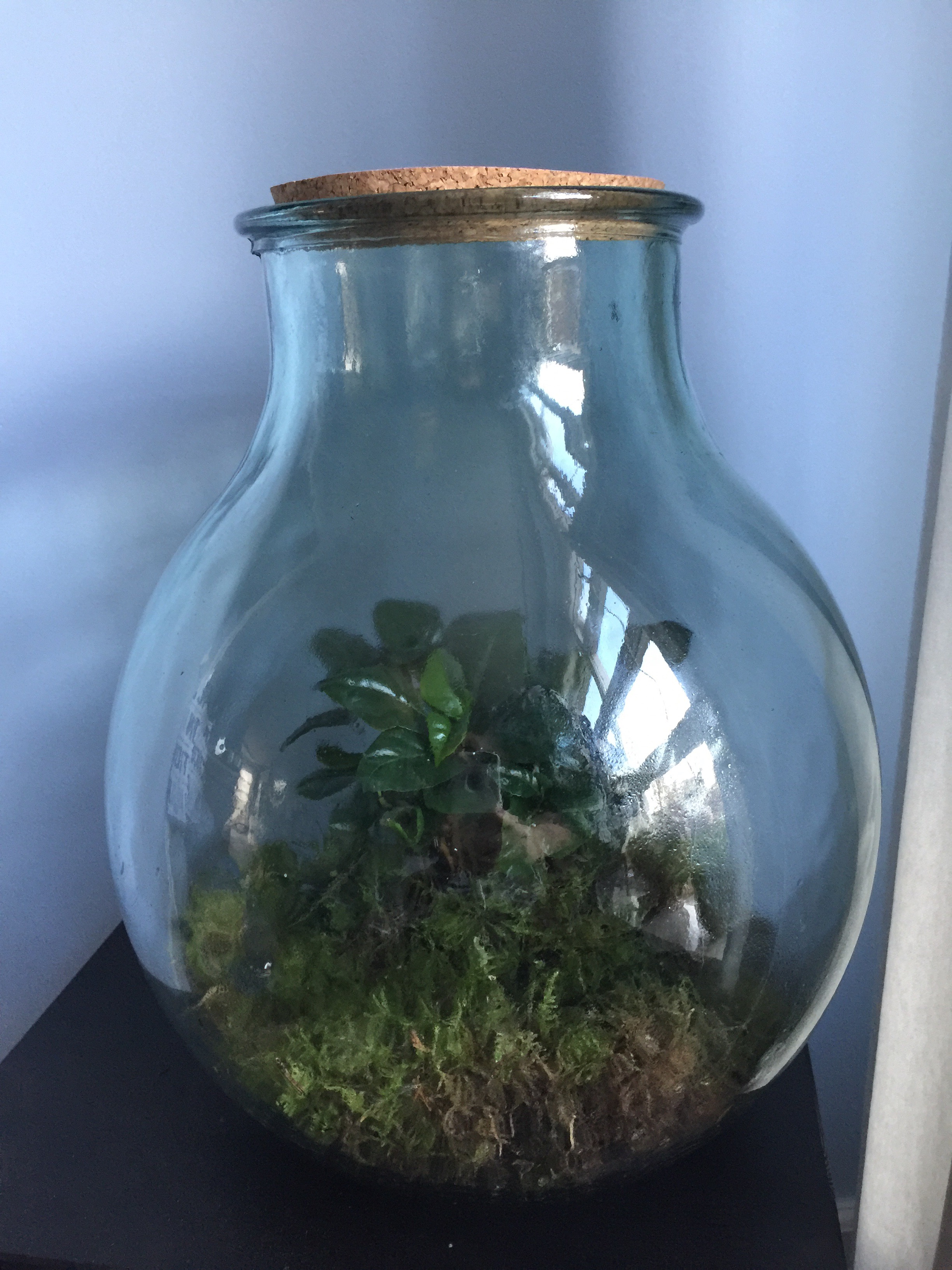 Al een poosje staat er een enorme glazen pot in mijn vensterbank, met daarin een pikaplantje en wat mos, afgesloten met een grote kurk. Een mini ecosysteem. Ik kocht ‘m eens in de aanbieding bij de Intratuin voor € 26,95! Ik heb ‘m toevallig afgelopen week voorzien van wat vers mos, maar deze ecosystemen hebben nagenoeg geen verzorging nodig.
