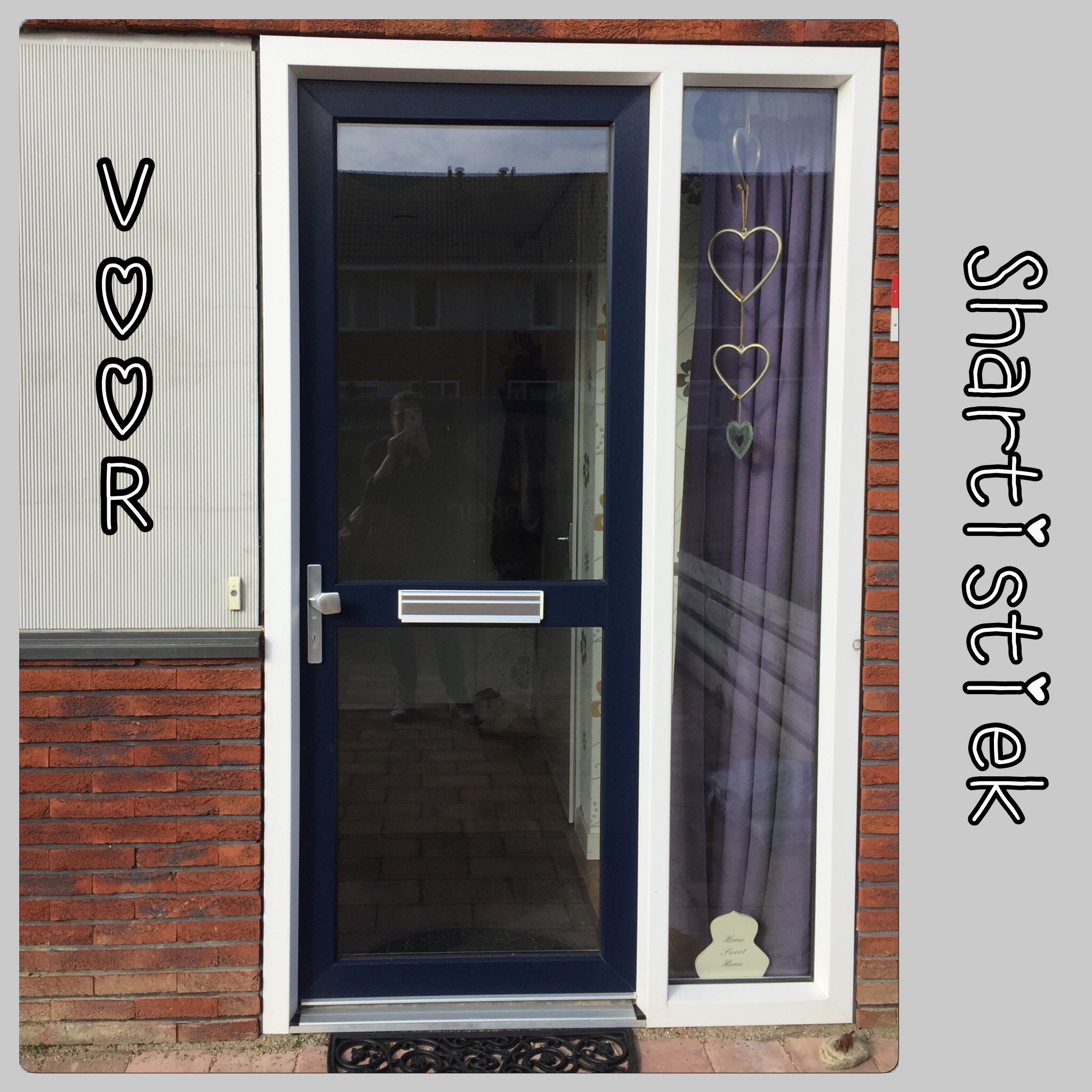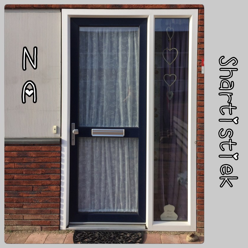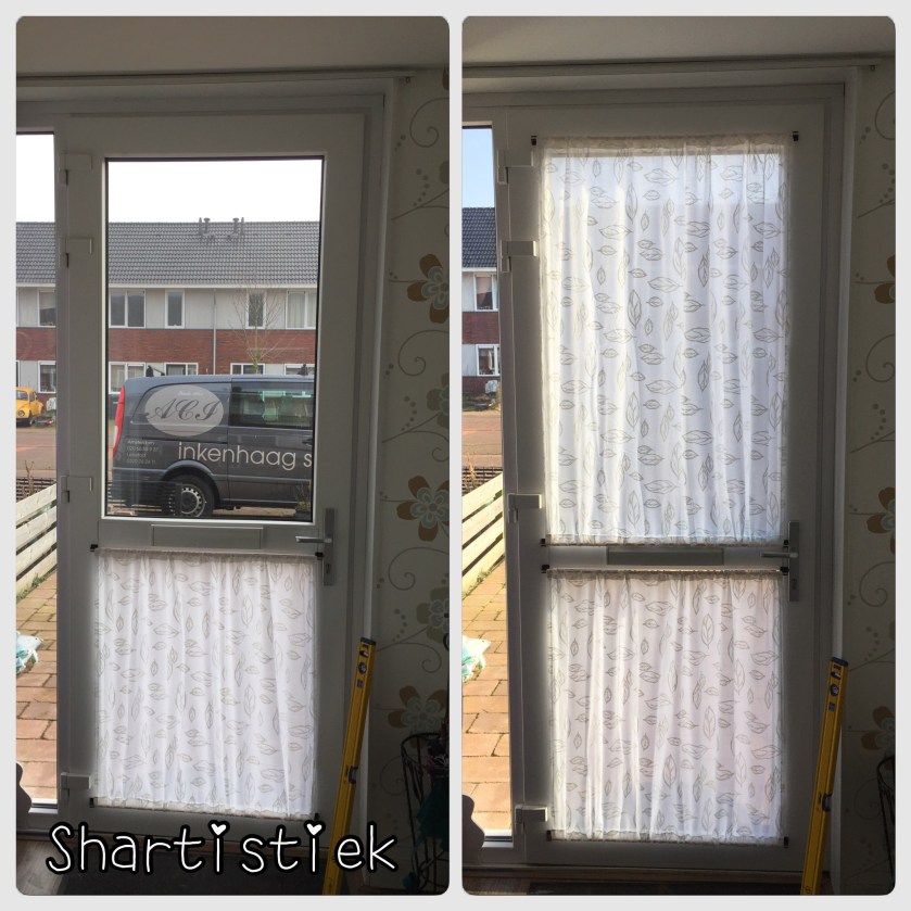Ik had bedacht dat ik wellicht een soort vitrage kon naaien. Alleen bracht ons dat bij het volgende probleem, de deur is van kunststof. Ze huurt het huis, dus boren in de deur vond ze niet zo’n goed idee.