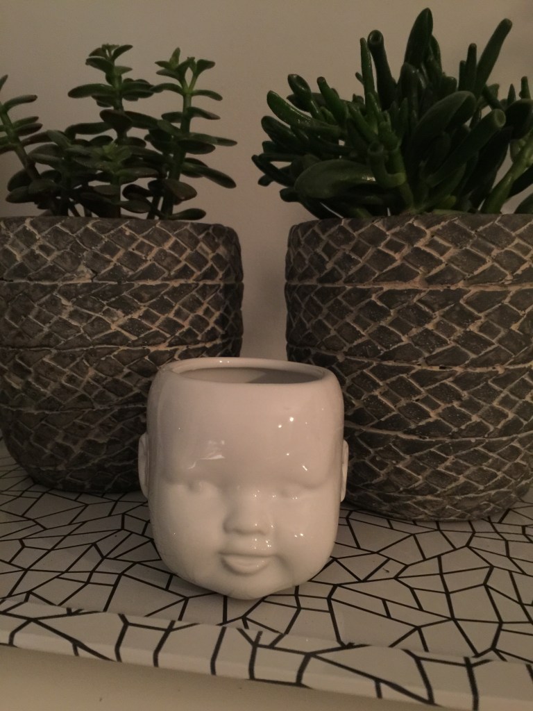 Een poosje geleden zag ik een potje in de vorm van een kinderkopje (online) bij Mooi in Sittard! Ik was verkocht. Iets wat mijn zus niet begreep, ze vond het maar een eng ding. Ha ha ha. Het bestellen ging per mail en het contact verliep vlot en prettig. Voor ik het wist, was ik de trotse eigenaar.