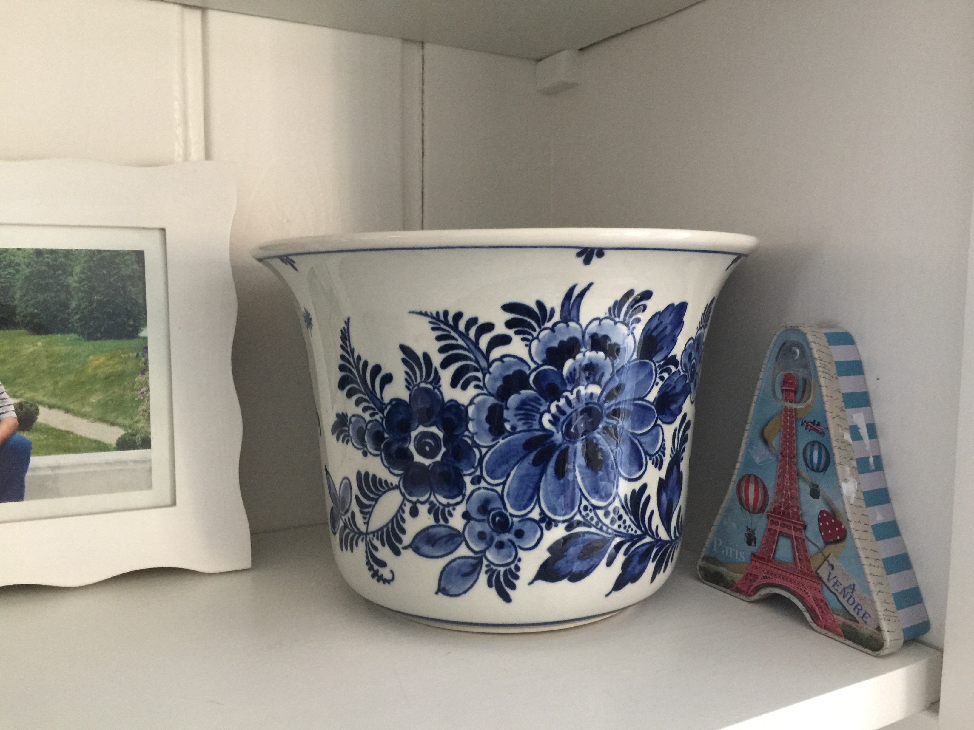 Tijdens mijn ‘wat wordt er in de buurt te koop aangeboden momentje’ op Marktplaats, zag ik twee Delft Blauwe bloempotten! Ik kon het niet direct eens worden met de verkoopster over de prijs. Misschien ook doordat ik toen niet wist dat ze best groot waren en origineel, handbeschilderd en gemerkt. Ik liet het even bezinken en deed uiteindelijk een laatste bod, waarop zij gelukkig akkoord gaf.