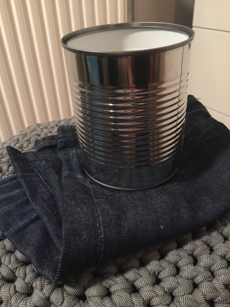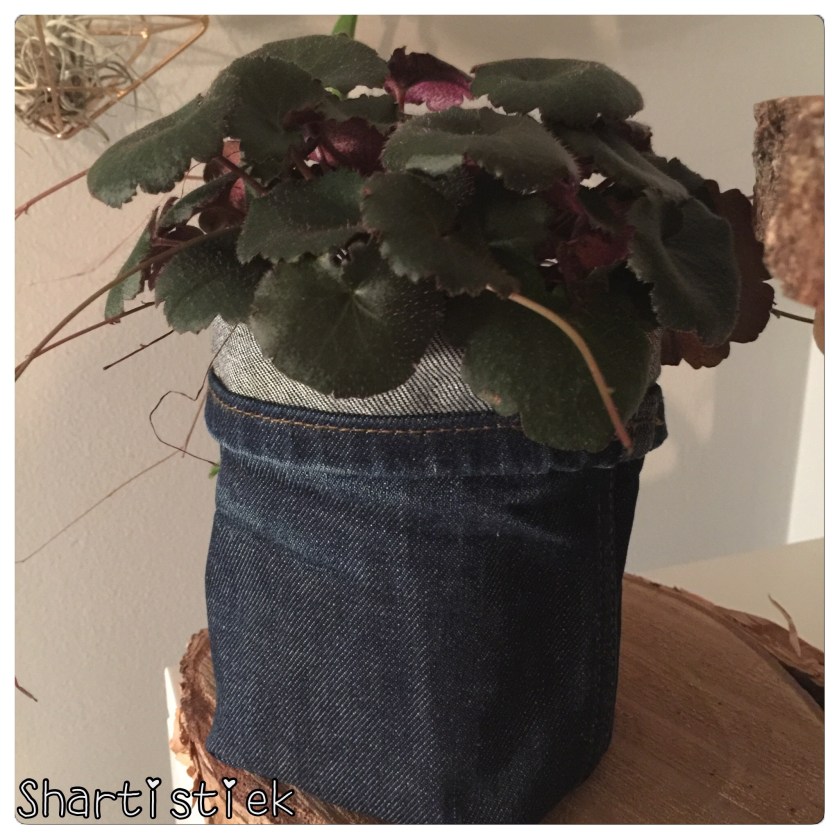 Het ging dus een bloempot worden! Van één broekspijp naaide ik een hoes voor om het blik, nog geen 5 minuten werk!
