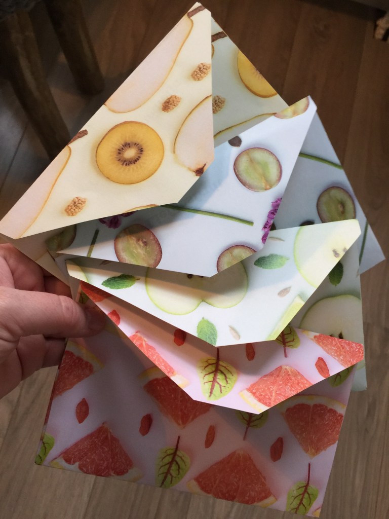 Enfin, na wat druk knip- en plakwerk verschenen daar mijn enveloppen. Zo eenvoudig, maar zo’n leuk resultaat. De envelop op zich is al een feestje als je deze om een kaart of briefje krijgt!