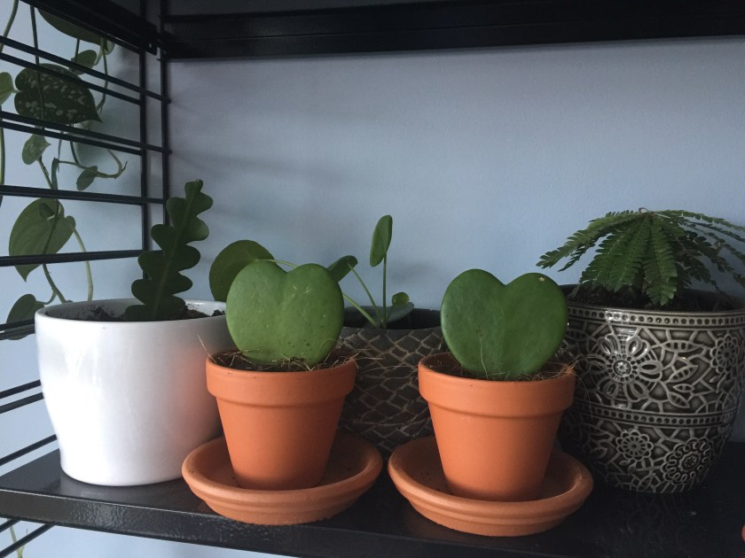 De haak waar het rek aan hangt was eerst wit, maar met een spuitbus zwarte verf omgetoverd. 🙂 Het kleine hangpotje kreeg ik een keer van Marjolein, een collega van mijn zus. Onlangs kocht ik er een klein Erwten plantje voor. De plaatjes zaten erbij, die zullen mettertijd plaats maken voor wat eigen prullaria, maar voor nu is het leuke aankleding.