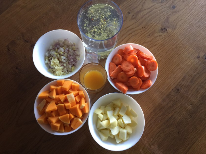Het pakket bevat flespompoen, wortel, sjalotten, gember, knoflook, appel, sinaasappel en groentebouillonblokjes. Ik heb nog nooit fruit of gember aan mijn pompoensoepen toegevoegd, dus het leek me leuk om te proberen.