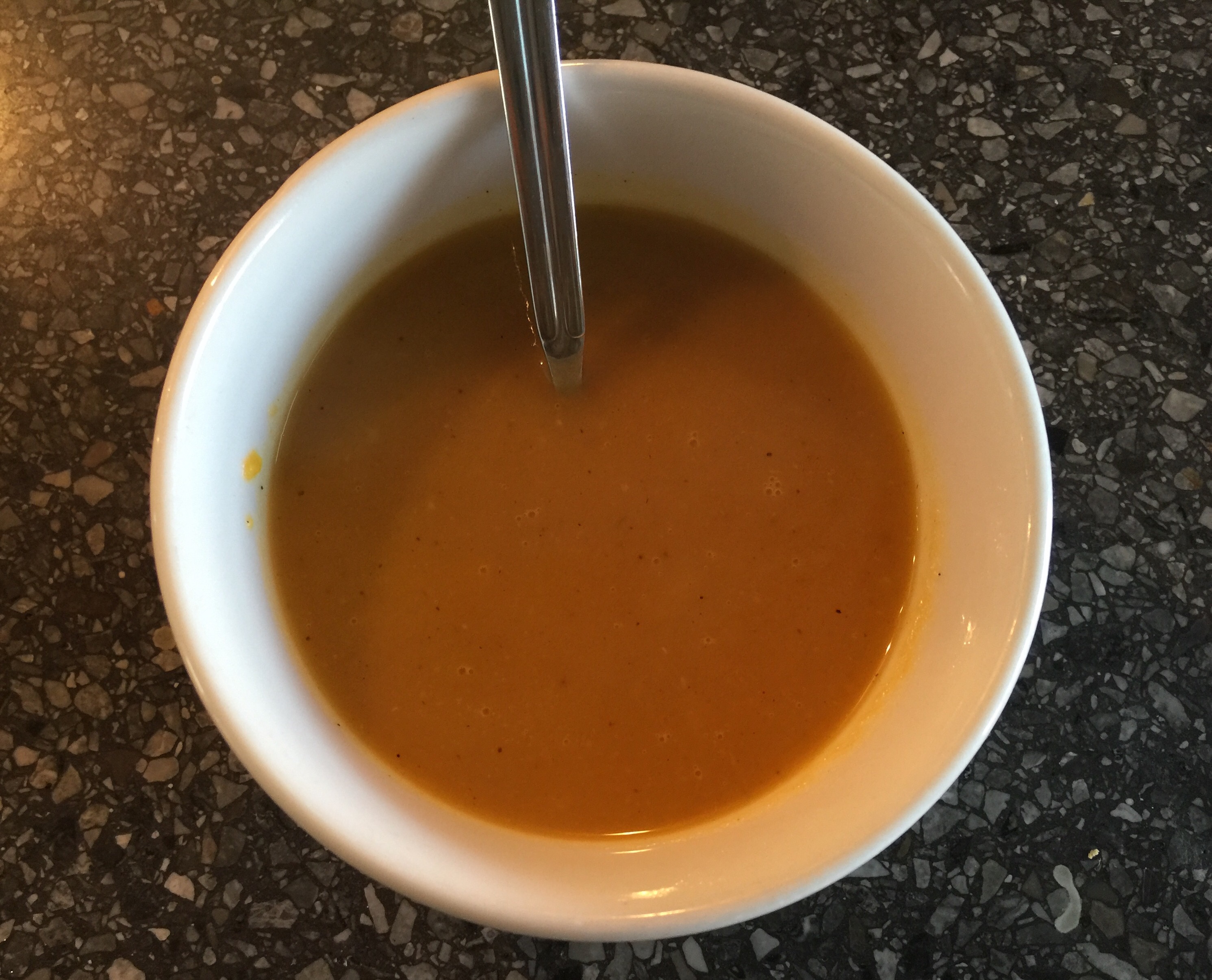 Als de soep in de kom zit, schenk je er een scheutje room door of pompoenpitolie. Dat laatste doe ik normaal altijd. 🙂 Dit keer koos ik ervoor om een Marokkanse twist te geven aan de soep, door twee theelepeltjes ras el hanout toe te voegen, tegelijk met de pompoen en wortel. Dit stond als tip op de verpakking van het soeppakket.